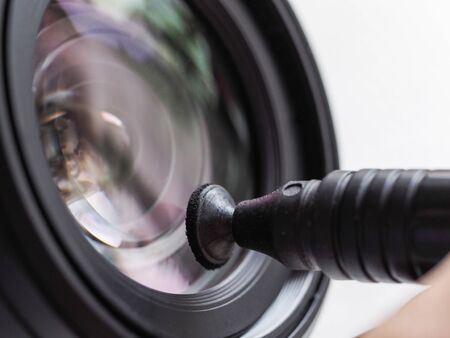 Human hand cleaning dust on camera lens with pen brush cleaner