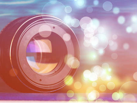 Camera lens on bokeh background, closeup. Filtered image