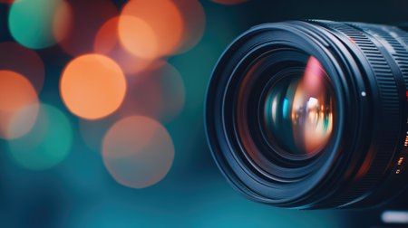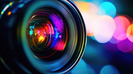 Camera lens closeup with colorful bokeh lights on black background