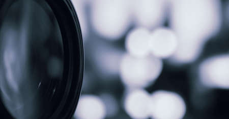Closeup of camera lens on bokeh background. Shallow depth of field