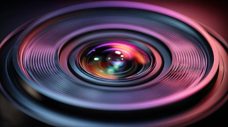 This striking close-up image of a camera lens showcases vibrant reflections and intricate patterns, perfect for photography enthusiasts and visual artists.