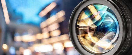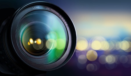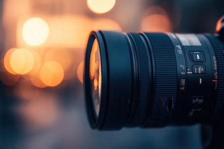 Close-up of a camera lens with bokeh background.