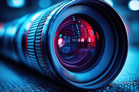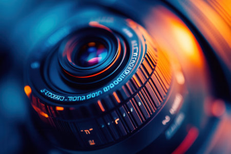 Close-up of a camera lens with vibrant blue and orange lighting.