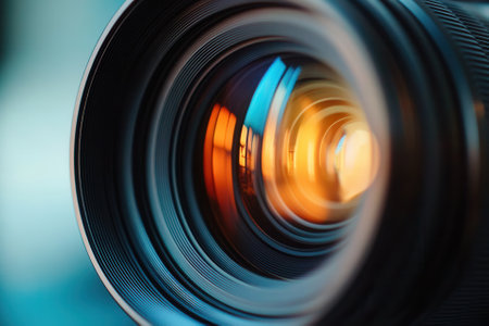 Camera lens close up, photography equipment, detailed optics, blue background, professional photography, precision optics, creative vision, macro photography, photography art, depth of field