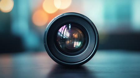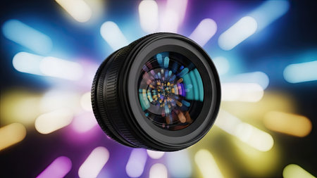 A mesmerizing display of vivid hues reflected on a camera lens, complemented by soft bokeh lights, forming an inspiring and artistic backdrop with blurred focus.