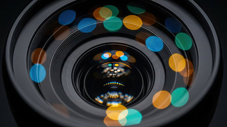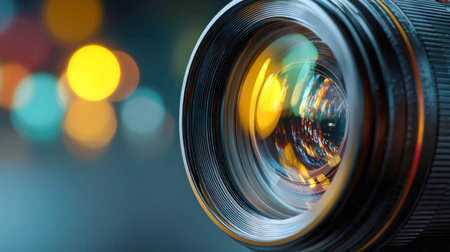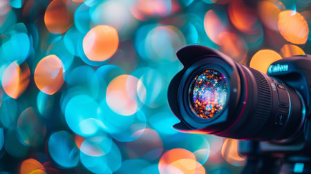 Close-up of a camera lens reflecting vibrant bokeh light effects