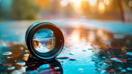 A camera lens placed on a wet surface with reflections and a blurred background, capturing the essence of photography and moments.