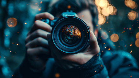 A photographer pointing the camera lens, capturing a reflection of nature, symbolizing creativity, photography, and the connection between technology and nature.