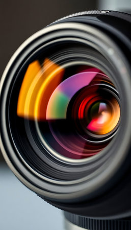 Close-up of a professional camera lens reflecting vivid multicolored light, showcasing optical beauty and precision