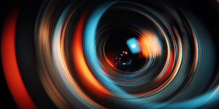 Beautiful reflections of multicolored studio lights in a camera lens, captured in a high-contrast close-up