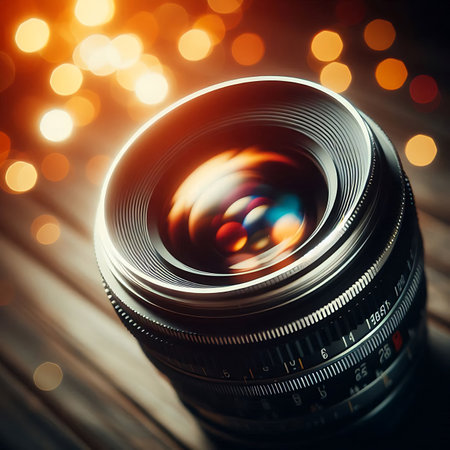 Detailed close-up of a camera lens with vibrant bokeh lights in the background, highlighting photography and technology.