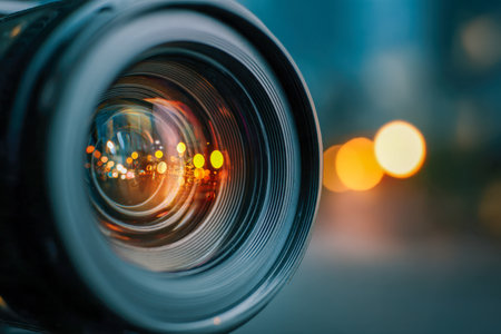A close-up of a camera lens capturing vibrant urban lights, creating a mesmerizing reflection, with soft, out-of-focus bokeh backdrop for modern photography themes.
