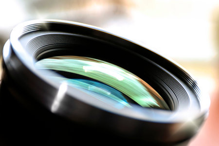 Close up picture of a professional optic photo lens. Smooth blurry background, warm colors.