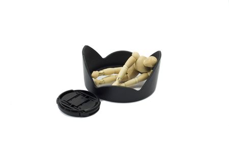 Photographer's accessories. Plastic cover for lens protection. Nearby is a device for mounting on the lens: elastic band and thread. isolated on a white background