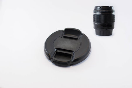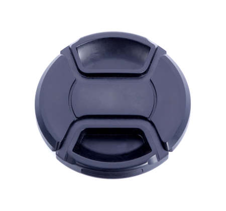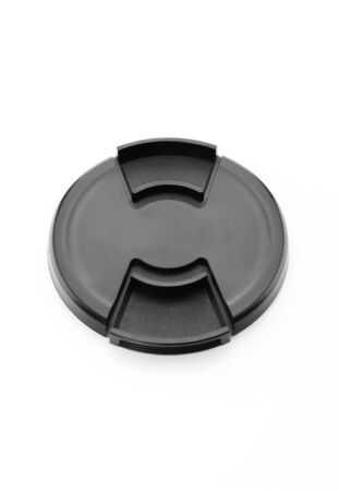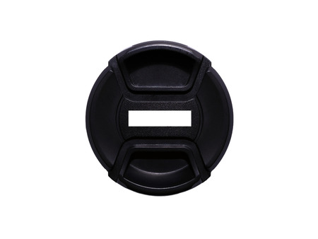 Black lens cap with white blank for your brand. Isolated on white background with clipping path and copy space