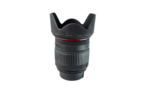Photograph of a black colored camera with lens attached to it placed on an isolated white background