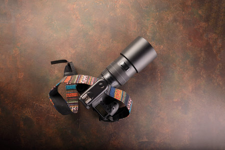 closeup vintage style of digital mirrorless camera with leather strap.