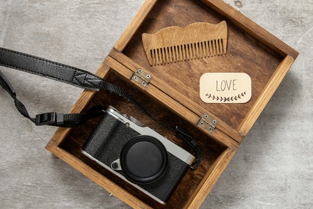 Camera and tools on a wooden background. Shallow depth-of-field.