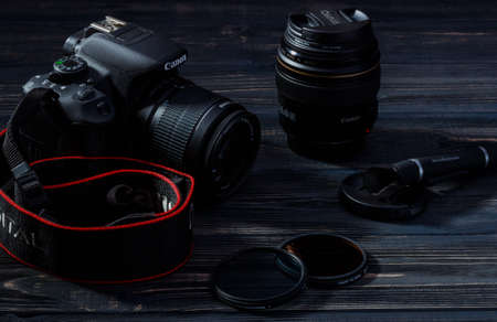 Izmail, Ukraine. April 2022. Canon EOS photo camera with L series zoom lens 24-105 mm on grey background, copy space