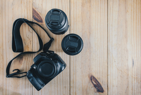 Camera and tools on a wooden background. Shallow depth-of-field.