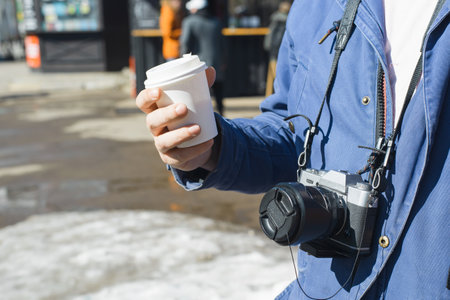 Man with digital camera holding cup of coffee outside, close-up. Concept tourist, traveler.
