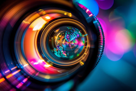 Vibrant close-up of a camera lens with colorful defocused lights creating an abstract backdrop