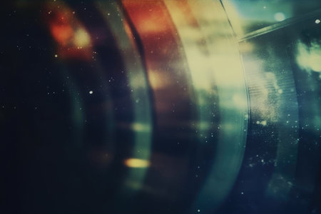 Close up of a camera lens with colorful bokeh on dark background, ideal for banner design space