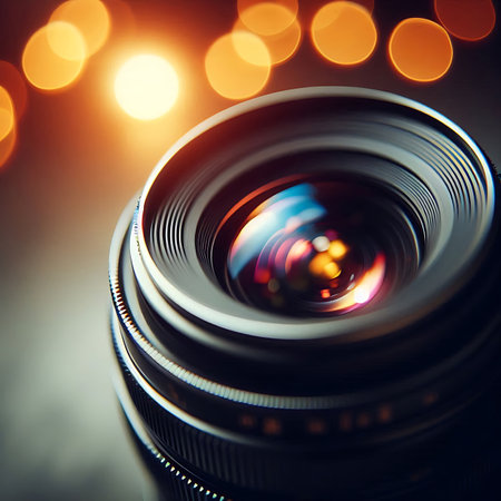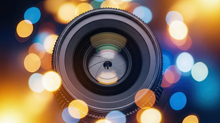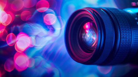 Captivating lens of a camera with vibrant bokeh effects in the background