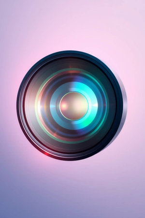 Sharp close-up of a clean camera lens showing concentric circles and shimmering light reflections in various colors
