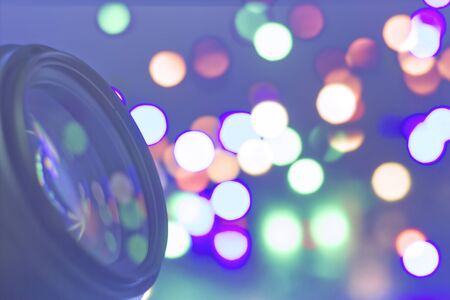 Camera lens with bokeh lights background. Filtered image processed vintage effect.