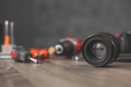 Precision optical dslr lens service, adjustment and alignment. Camera lens repair set in photo engineer workspace. Maintenance support of photographic photo camera lenses