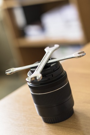 two keys and lens on wooden background. Camera repair and lens. Bad repair.