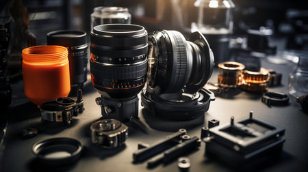 A visually appealing arrangement of various camera lenses and accessories on a dark surface, showcasing the intricate details and designs of each component.