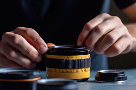 Craftsman carefully fixes a camera lens using precision tools in a dimly lit workshop environment.