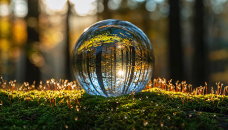 A crystal ball rests on moss, reflecting an inverted image of a sunlit autumn forest.