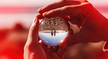 Hands hold a glass sphere that reflects an inverted coastal scene with a silhouetted figure and soft bokeh background. Warm red tones and blurred empty areas provide copyspace and room for text or design elements