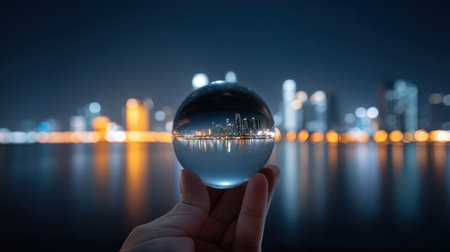 A captivating image of a crystal ball held in hand, reflecting a stunning nighttime cityscape filled with bright buildings and soft water lights, evoking wonder.