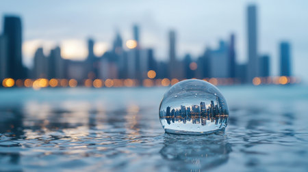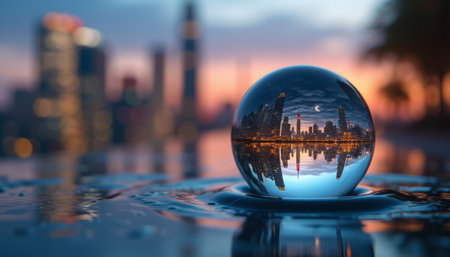 A stunning glass sphere reflects a vibrant city skyline at dusk, featuring colorful lights and tranquil waters. Captivating urban beauty in a unique perspective.