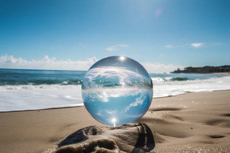 crystal ball on the beach with sea and blue sky background.