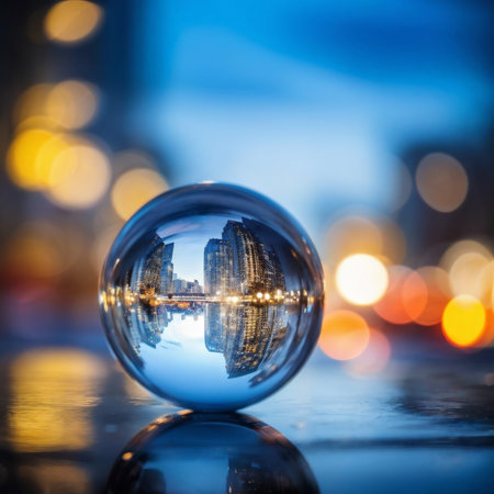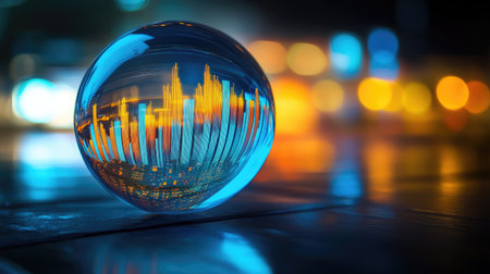 A stunning crystal sphere captures the vibrant reflection of a city skyline at night, showcasing modern architecture and dazzling lights. Perfect for urban photography enthusiasts.