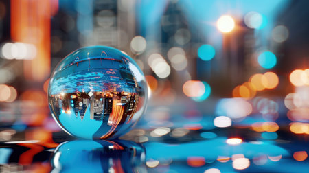 An artistic shot capturing a glass sphere reflecting a vibrant cityscape with colorful bokeh lights, creating a magical and mesmerizing urban atmosphere.