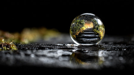 A clear sphere sits on a wet surface, reflecting a distorted image of trees and a blurred background. The composition features a shallow depth of field, with soft focus elements and natural lighting. This image could be used for various projects, including those related to nature, environment, or abstract concepts.
