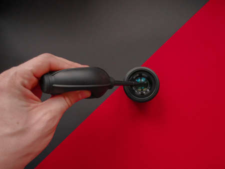 Hand holding an old camera lens on red background
