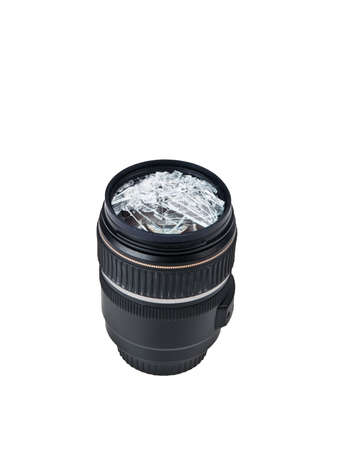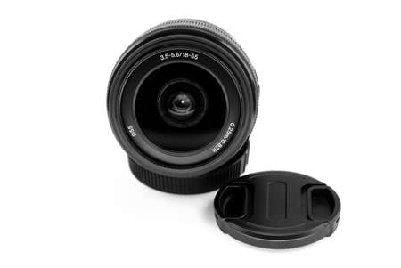 Close up of a lens with protective cover isolated on white.
