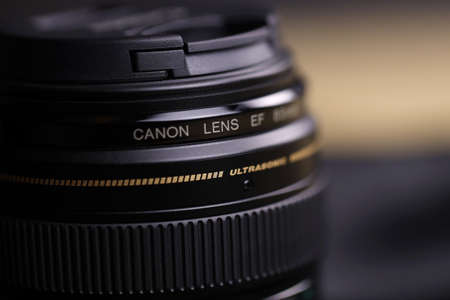 Izmail, Ukraine. April 2022. Canon EOS photo camera with L series zoom lens 24-105 mm on grey background, copy space