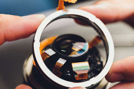 Precision prime optical dslr lens service, adjustment and alignment. Camera lens repair set in photo engineer workplace. Maintenance support of photographic photo camera lens
