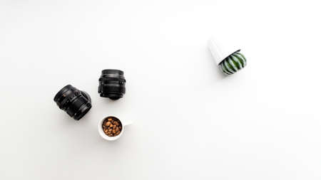 Abstract photo with camera lenses coffee and cactus plant sideways on a white background