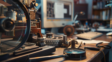 An old film editing station with a magnifying glass and splicing tools on the desk