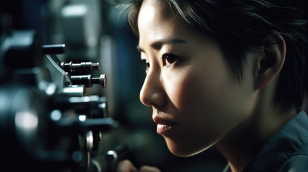 Machinist Female Asian Middle-Aged Operating machine tools in a manufacturing setting, producing precision parts. Generative AI AIG22.