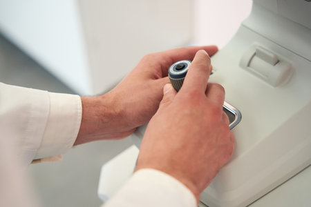 Ophthalmologist is using machine for examining eyesight in the hospital